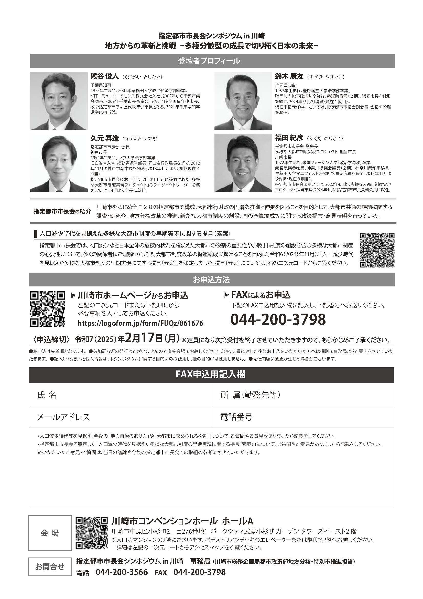 指定都市市長会シンポジウム 事務局(川崎市総務企画局都市政策部地方分権・特別市推進担当)